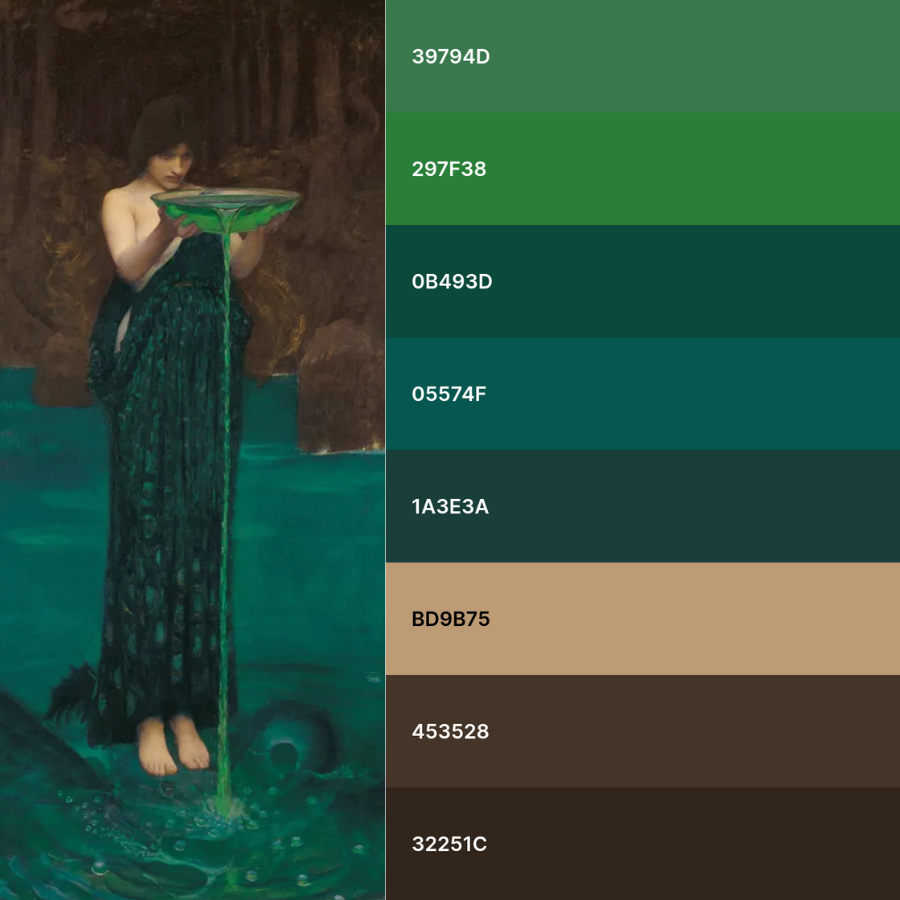 Here’s a palette I created using Circe Indvidiosa by John William Waterhouse. This is a stunning image filled with hypnotic greens and using a color picker tool, you can isolate specific hues and generate a HEX code for each one. You can then use the HEX codes when creating your own graphic designs.