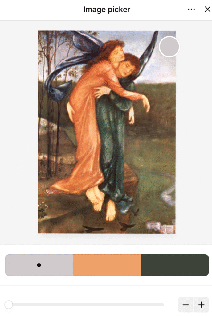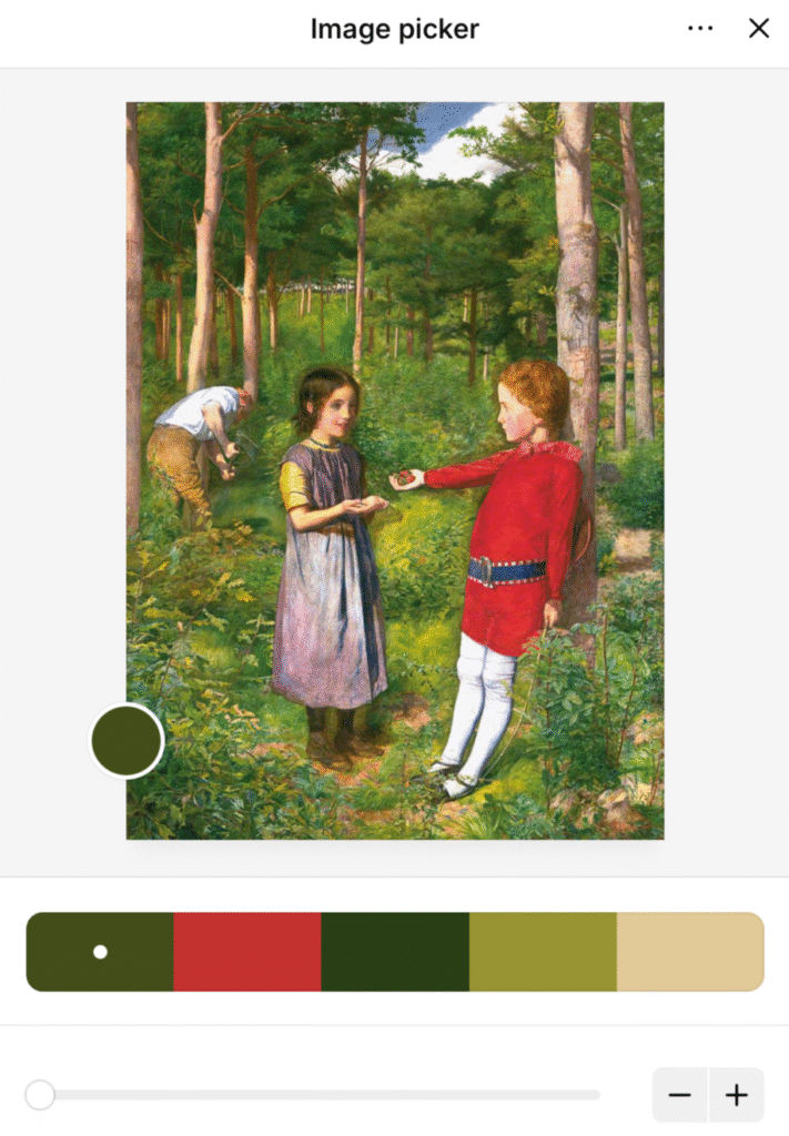 Upload the artwork and click on sections you love. Suddenly you have hex codes, CMYK values, RGB builds, the whole palette distilled from a brushstroke.
